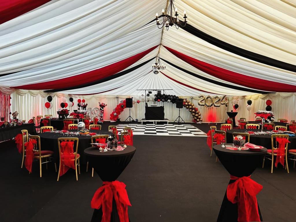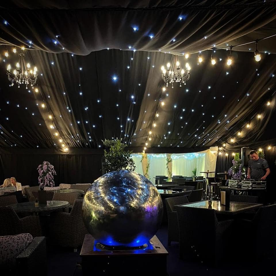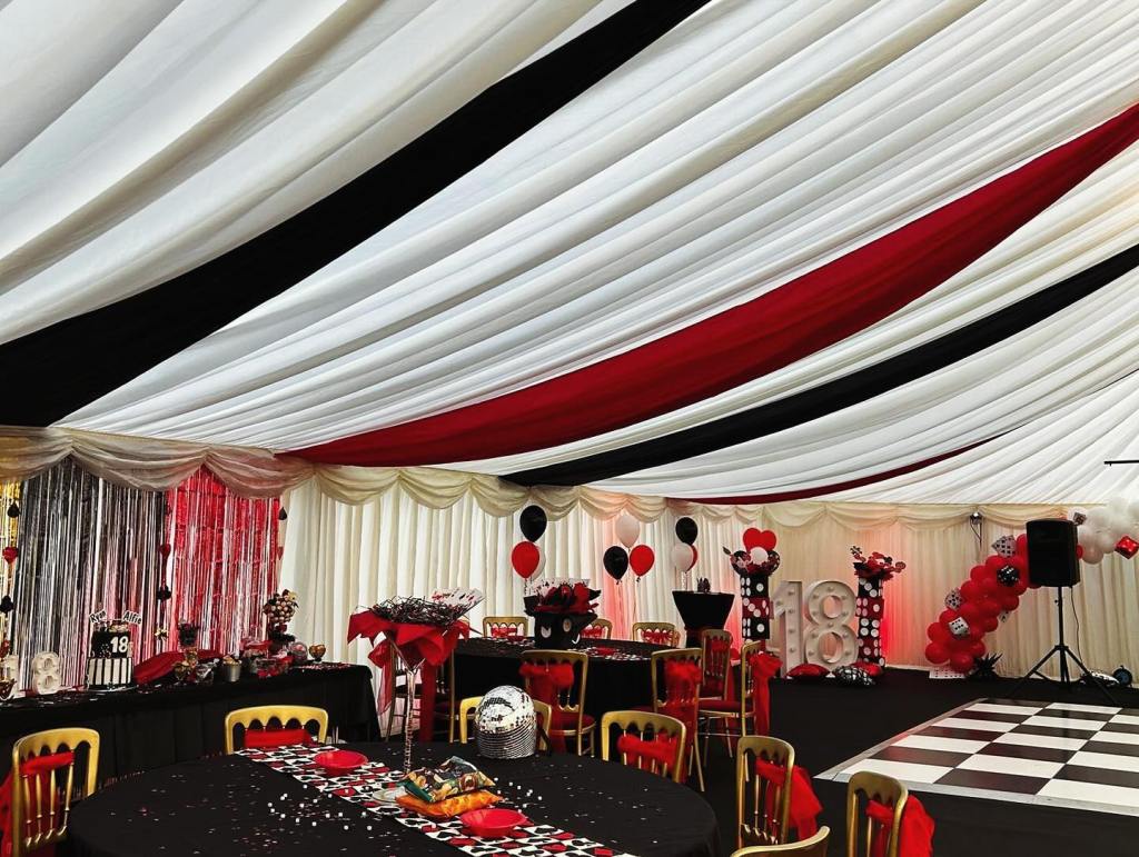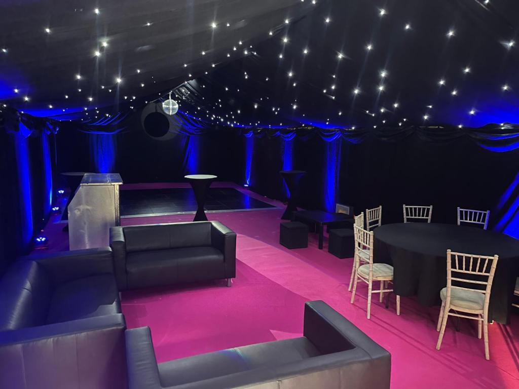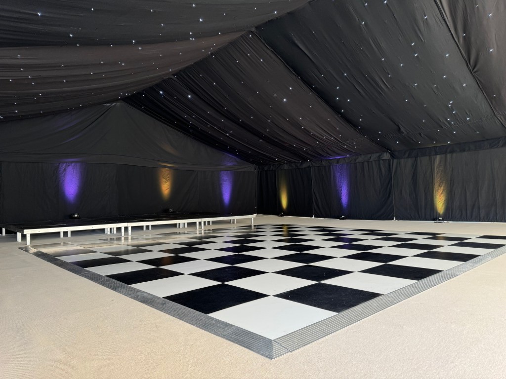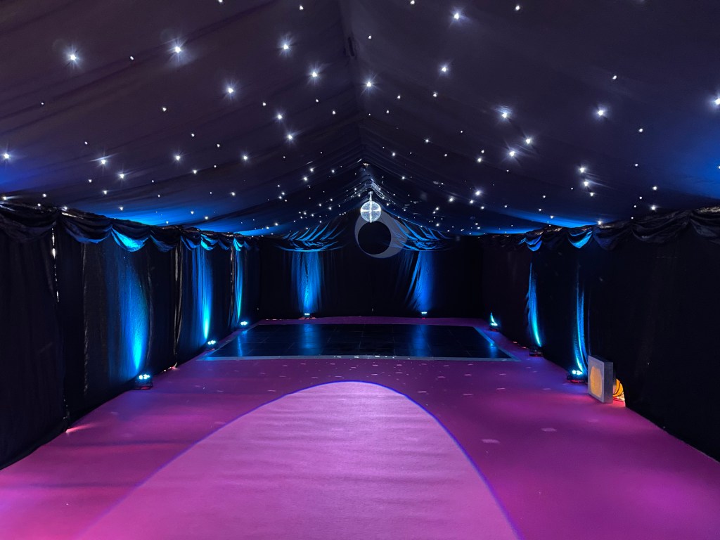 Experience the ultimate party atmosphere. See how our sleek black drapes create a sophisticated, high-energy venue for any event. Transform your marquee into a celestial escape and dance under the stars with our premium black linings and twinkling star cloth ceilings.
